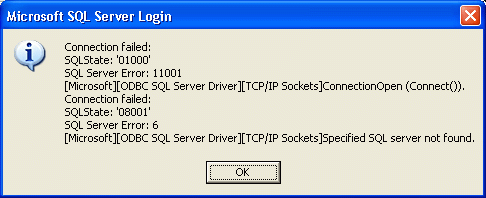 This prompt only appears if you are not able to connect to your SQL server. Enter the pre-assigned password or if your SQL server has been setup for "Trusted Connection", tick the checkbox and then click the Ok button The system will attempt to re-establish the connection to the various databases automatically. If your system display the followiing dialog it fail to connect.